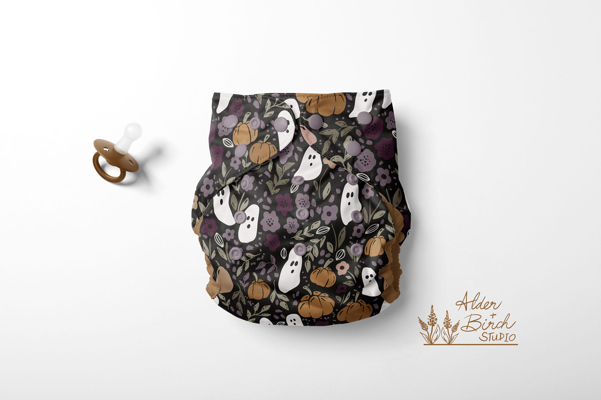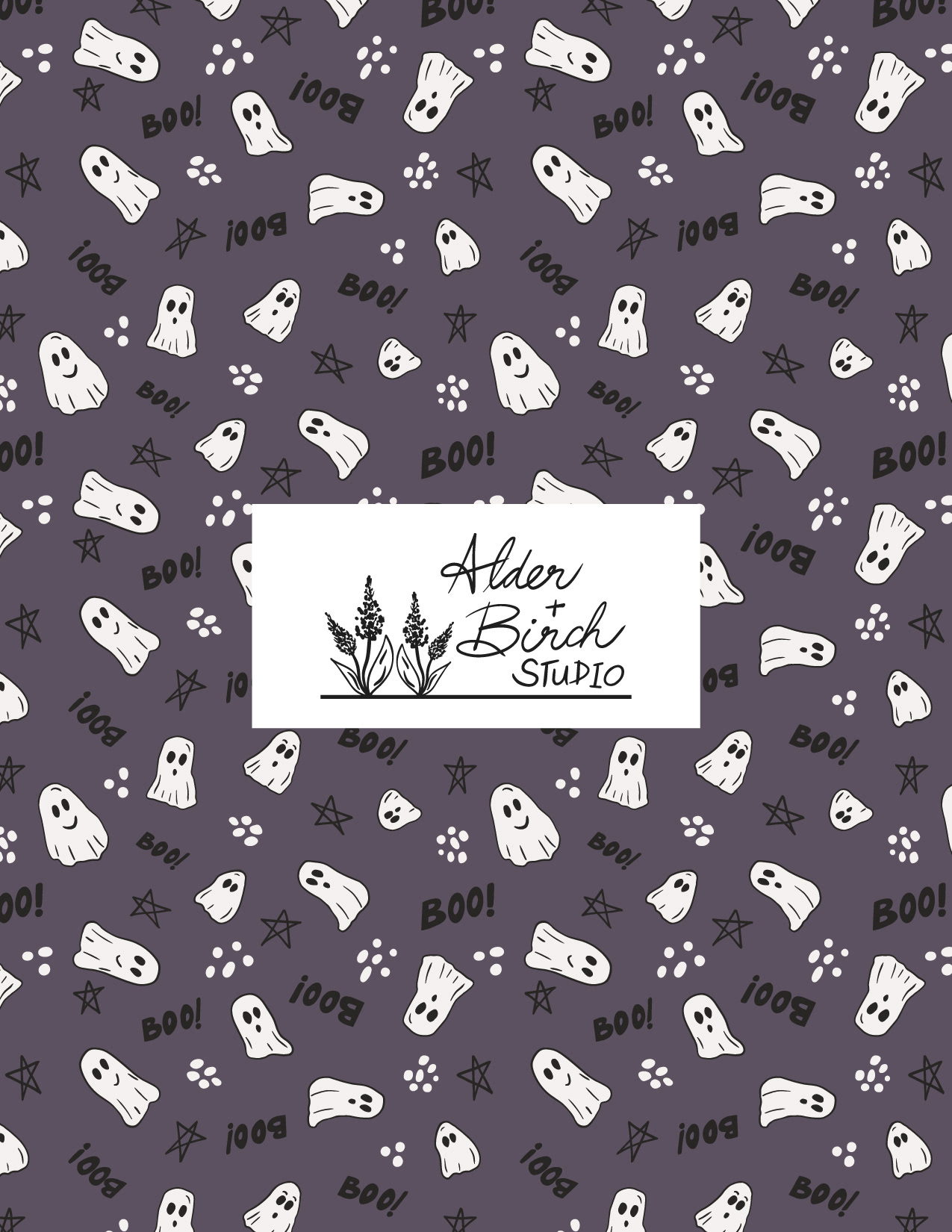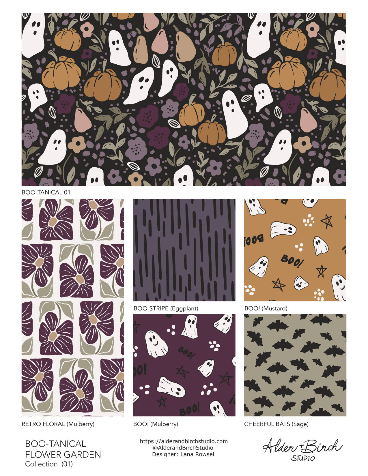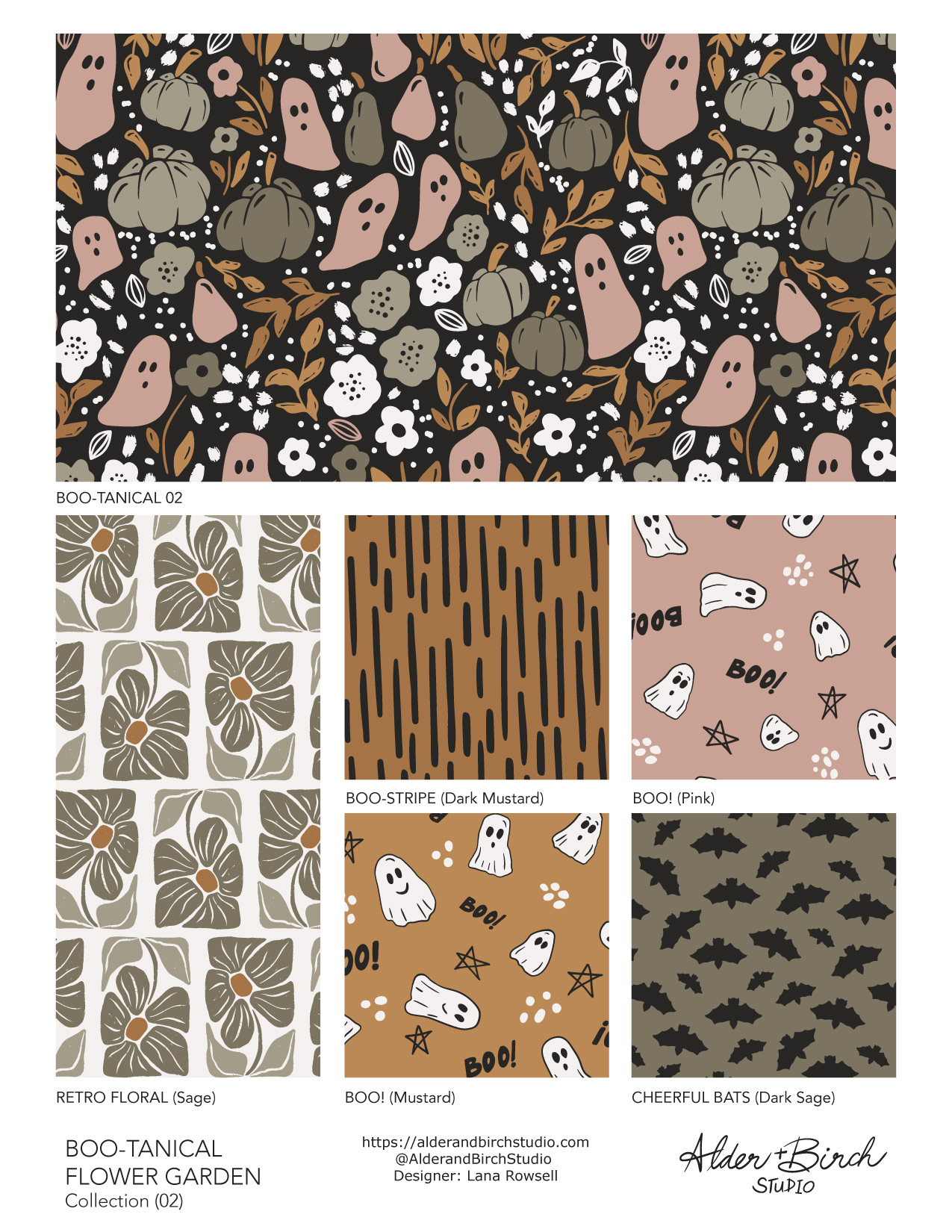 This Halloween pattern collection combines playful ghosts, cheerful bats, seasonal veggies and fruits, and cute BOOtanical florals. Rich colors like charcoal black, sage green, pumpkin orange, and eerie purple bring a moody yet whimsical vibe. Perfect for spooky-season projects, it’s a sweet-meets-spooky take on classic Halloween charm.